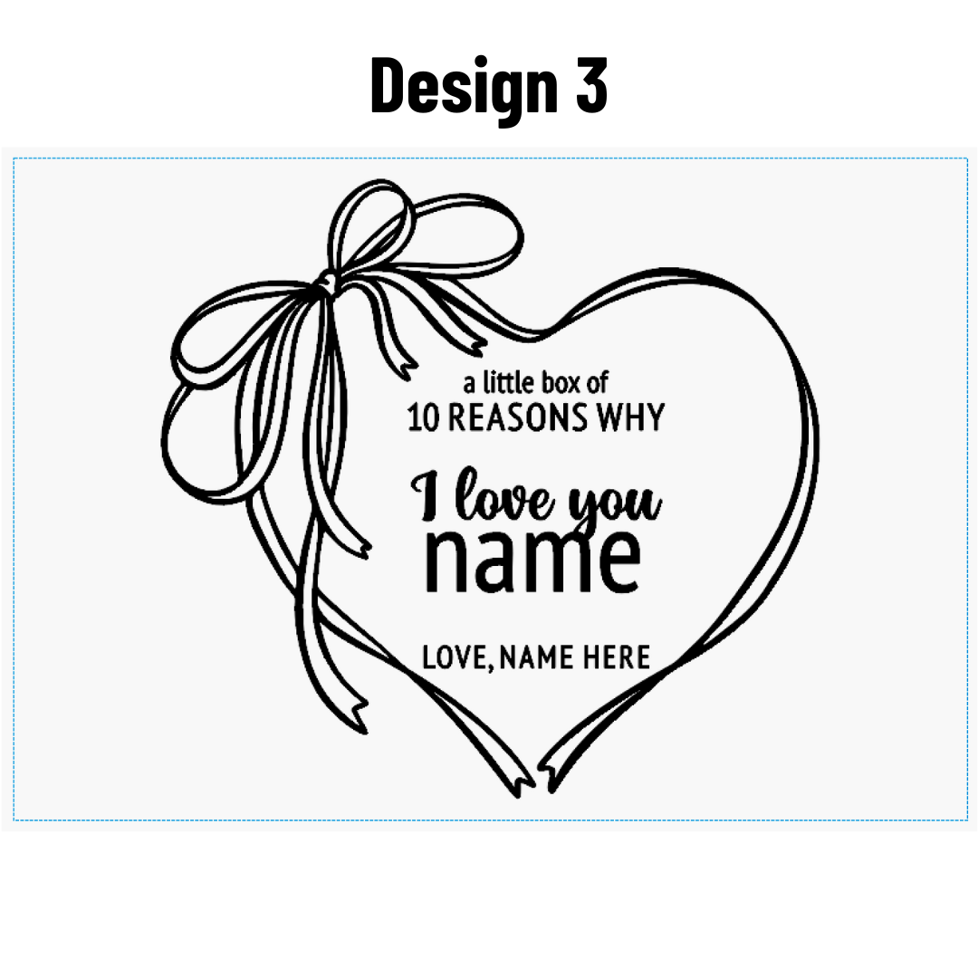 This personalized "10 Reasons Why I Love You" box makes a great keepsake gift to celebrate a Birthday, Anniversary, Valentine's Day or just a little gift to say "I Love You".