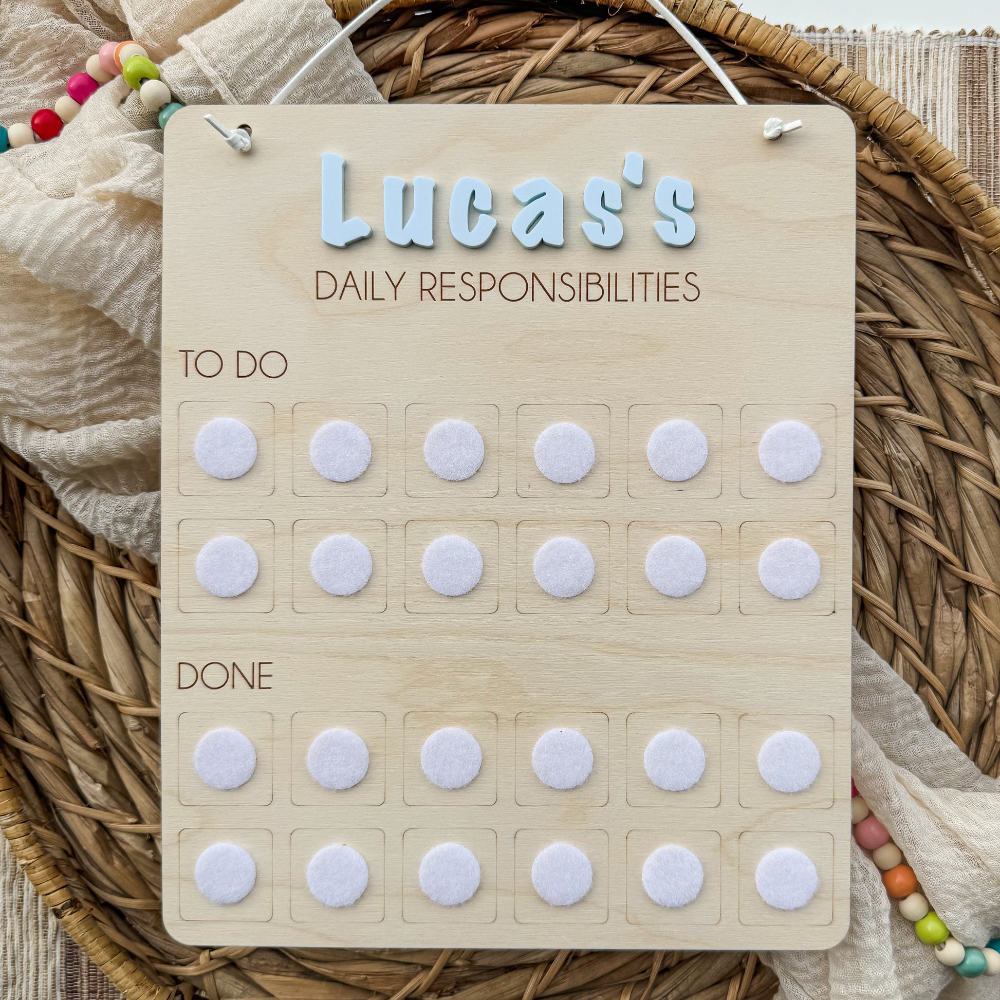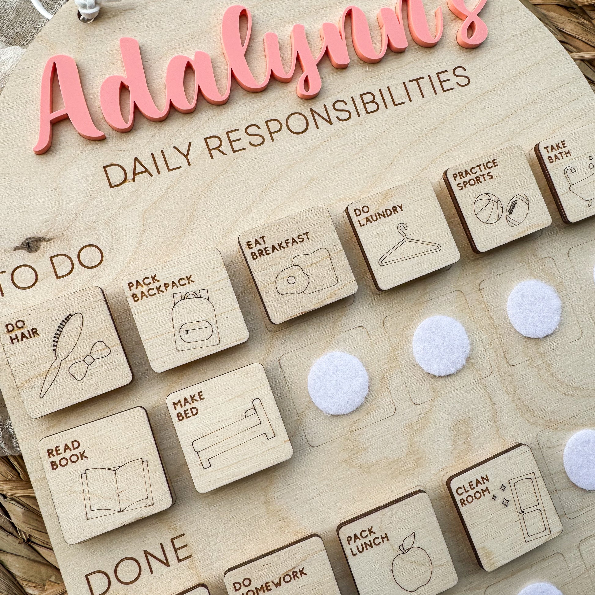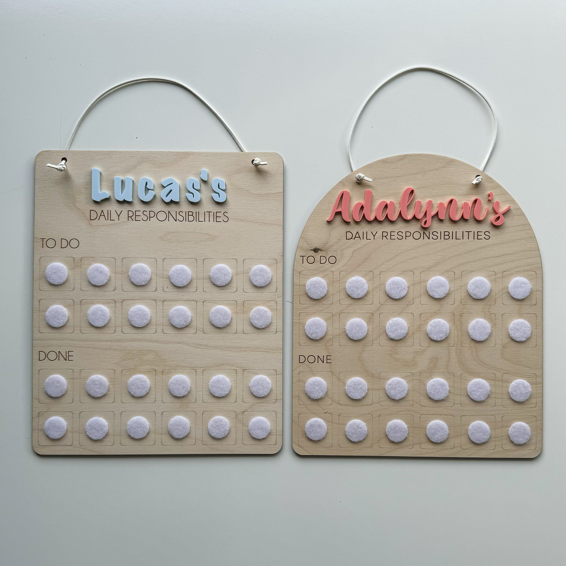 Introducing our kids daily responsibility chore chart. This chart is divided into two section of to dos and done. Once chore is completed it can be removed from the to do section and placed in the done. This is a fun and interactive way to teach responsibility and encourage good habits in children!