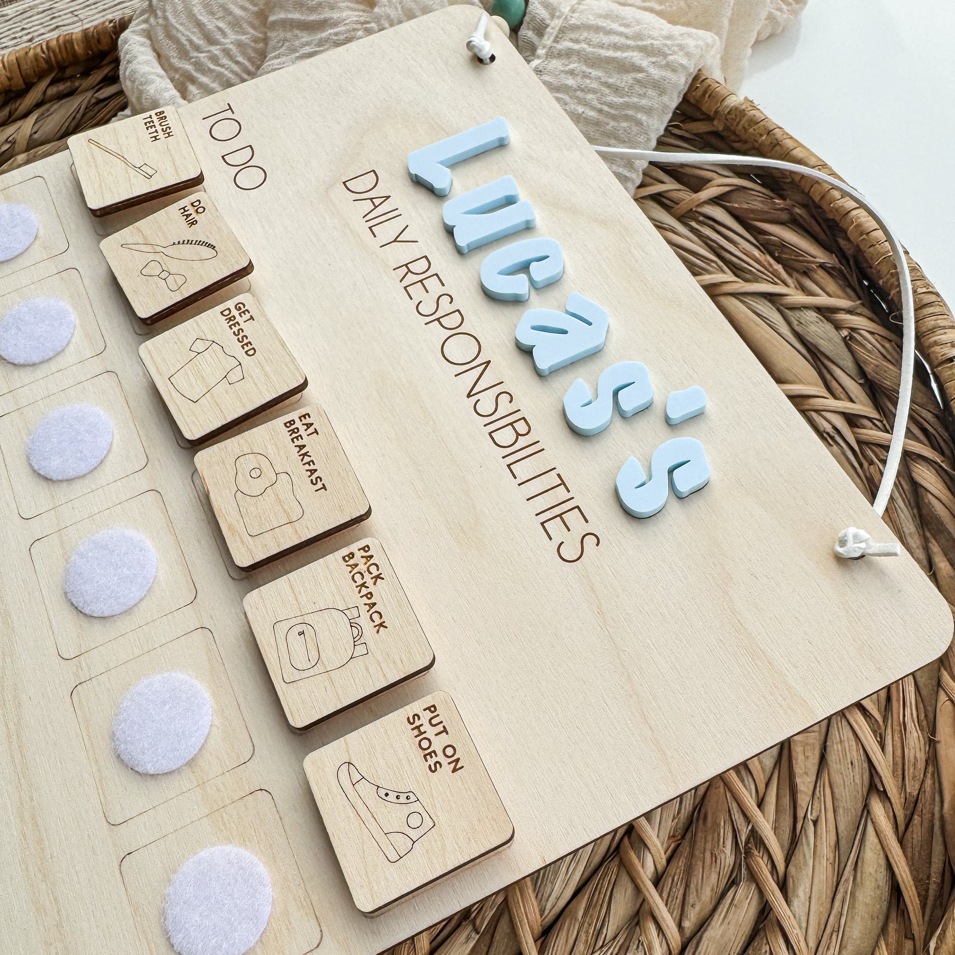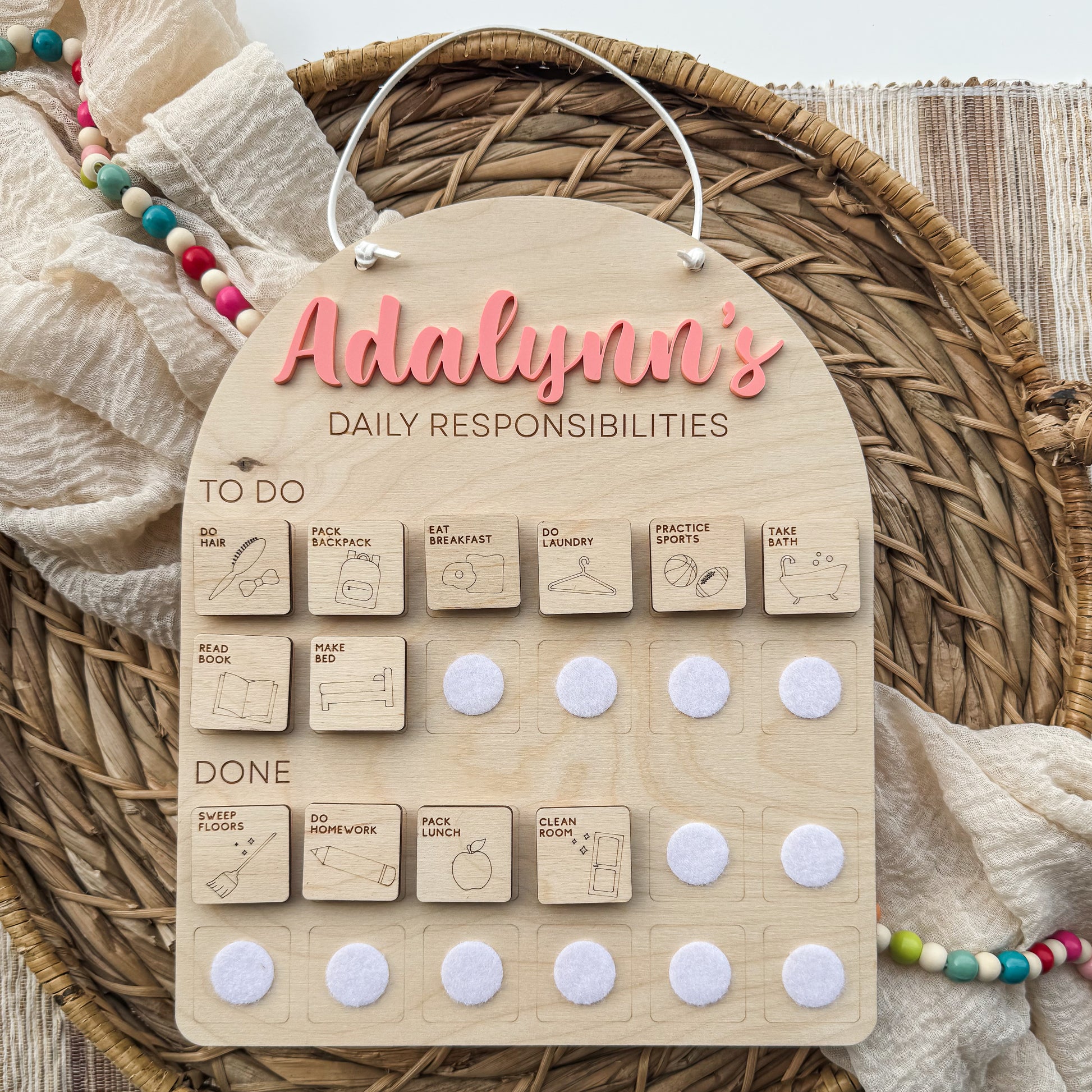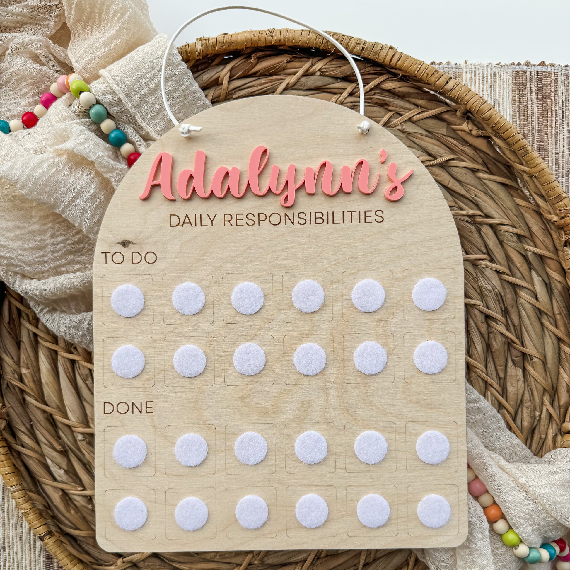 Introducing our kids daily responsibility chore chart. This chart is divided into two section of to dos and done. Once chore is completed it can be removed from the to do section and placed in the done. This is a fun and interactive way to teach responsibility and encourage good habits in children!