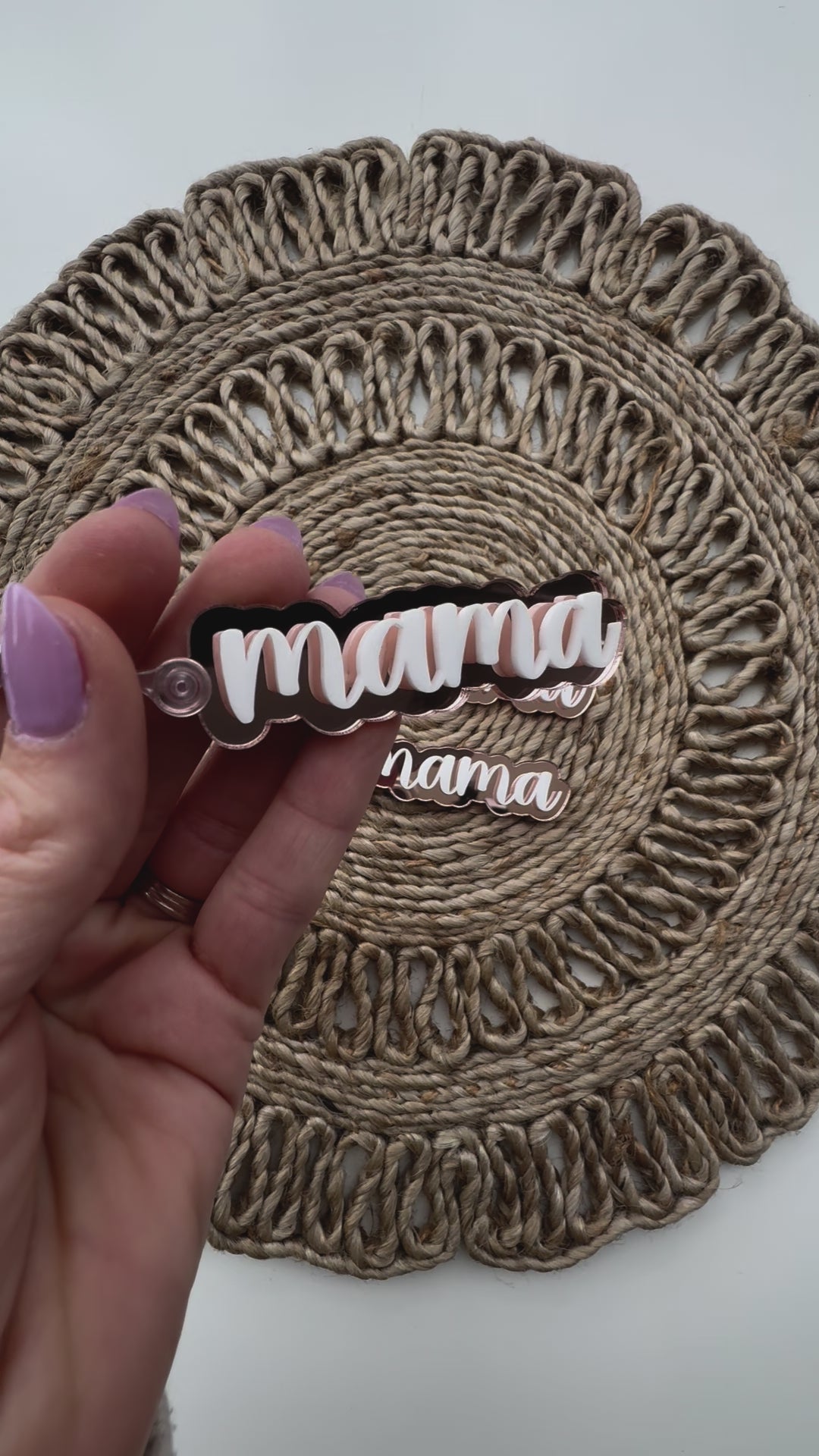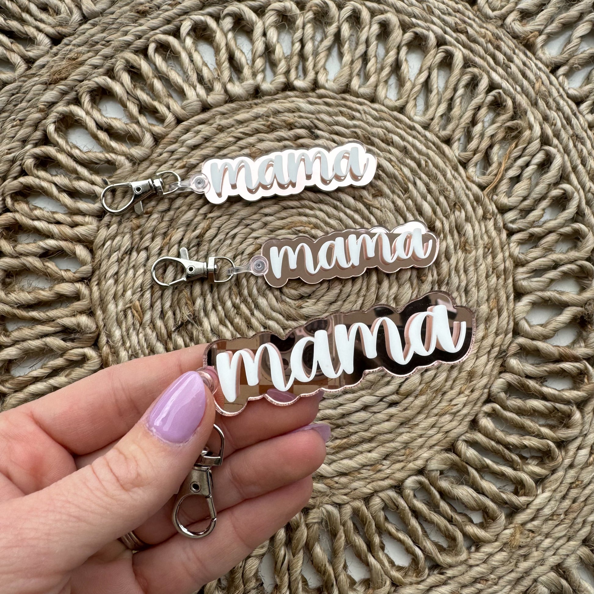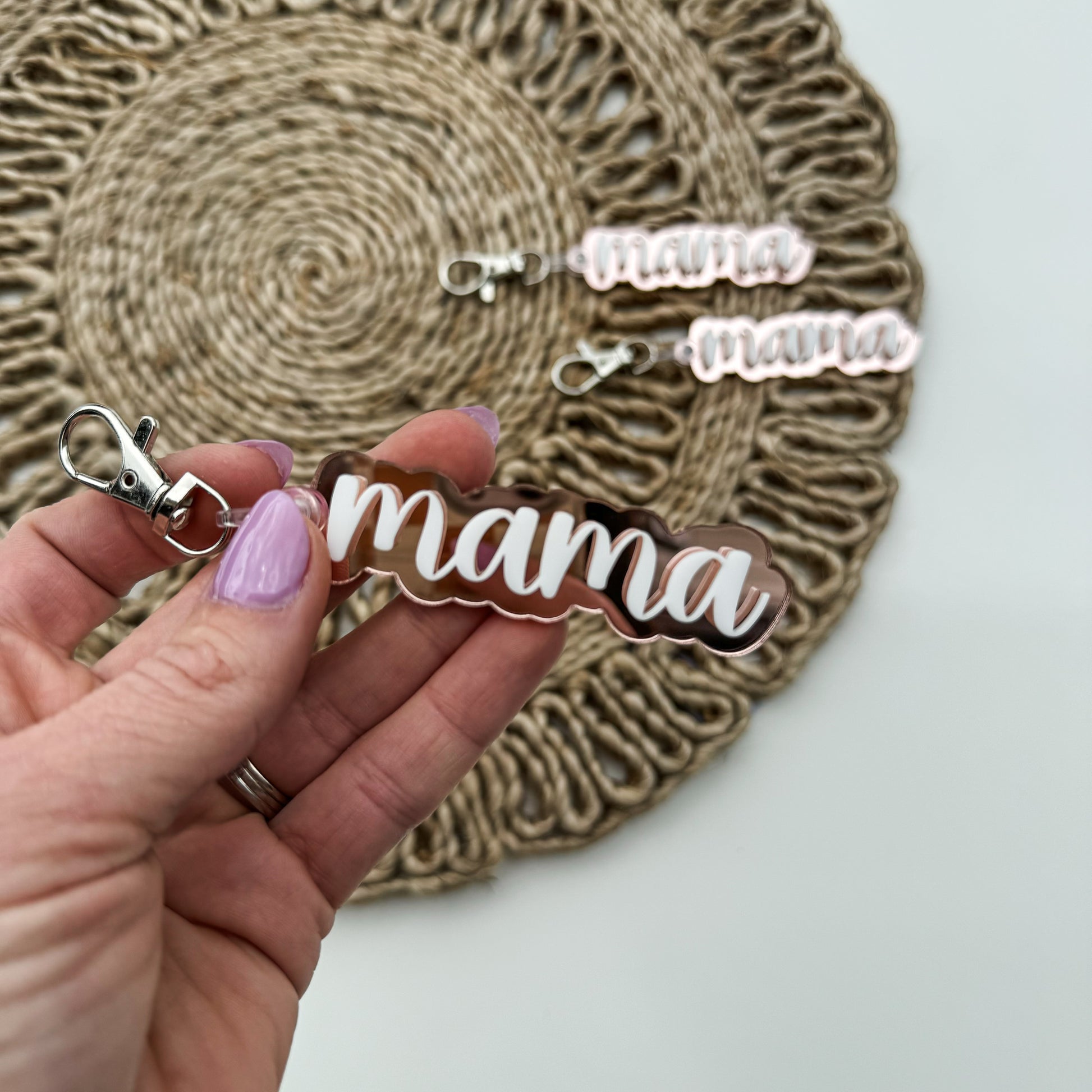 These keychains are stunning & photos don't do it justice. They are backed with rose gold mirrored acrylic and have white acrylic lettering on top. These can be customized with any wording.