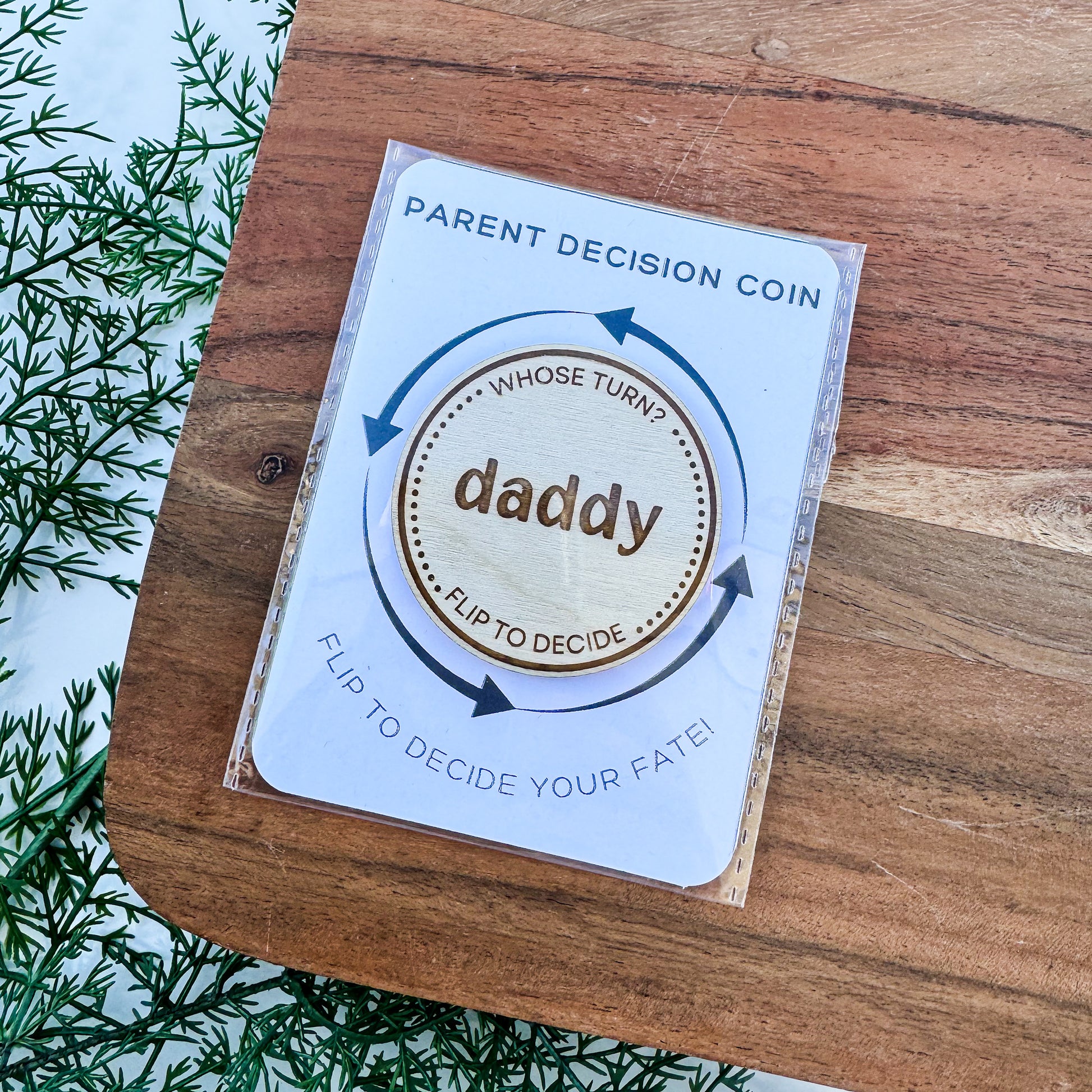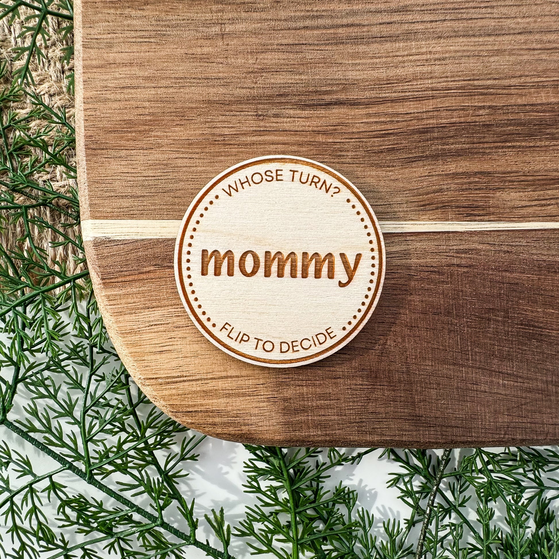 If you can’t decide who should change the next diaper, we have just the thing to take all the stress out of the situation! A double sided flip coin, one side says Mommy and the other says Daddy. Flip the wooden coin to decide your fate!