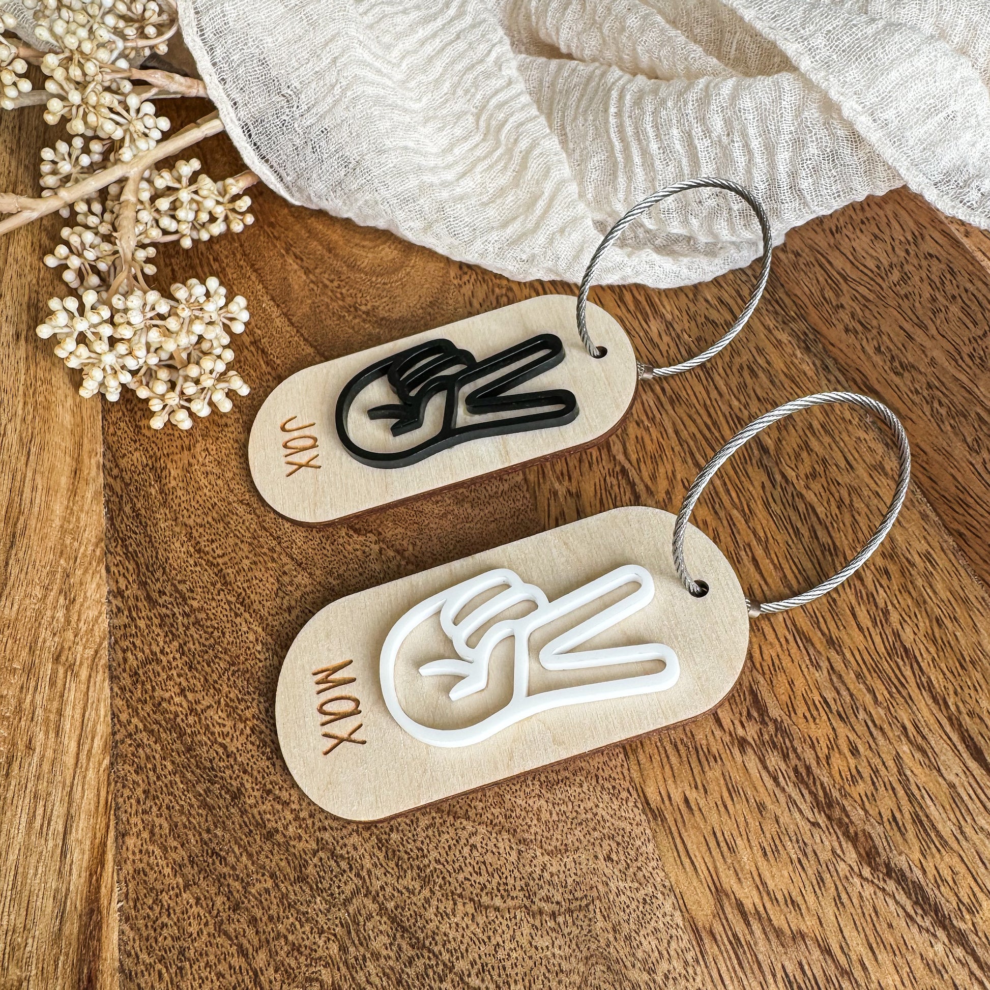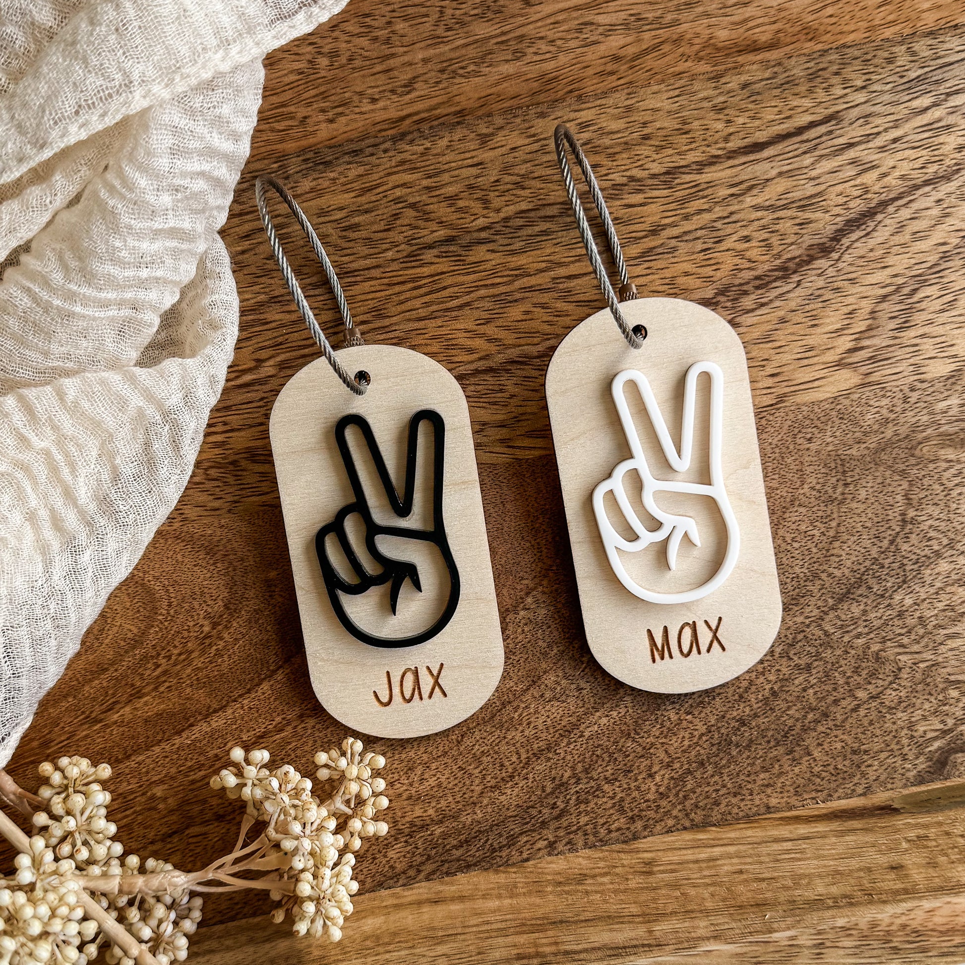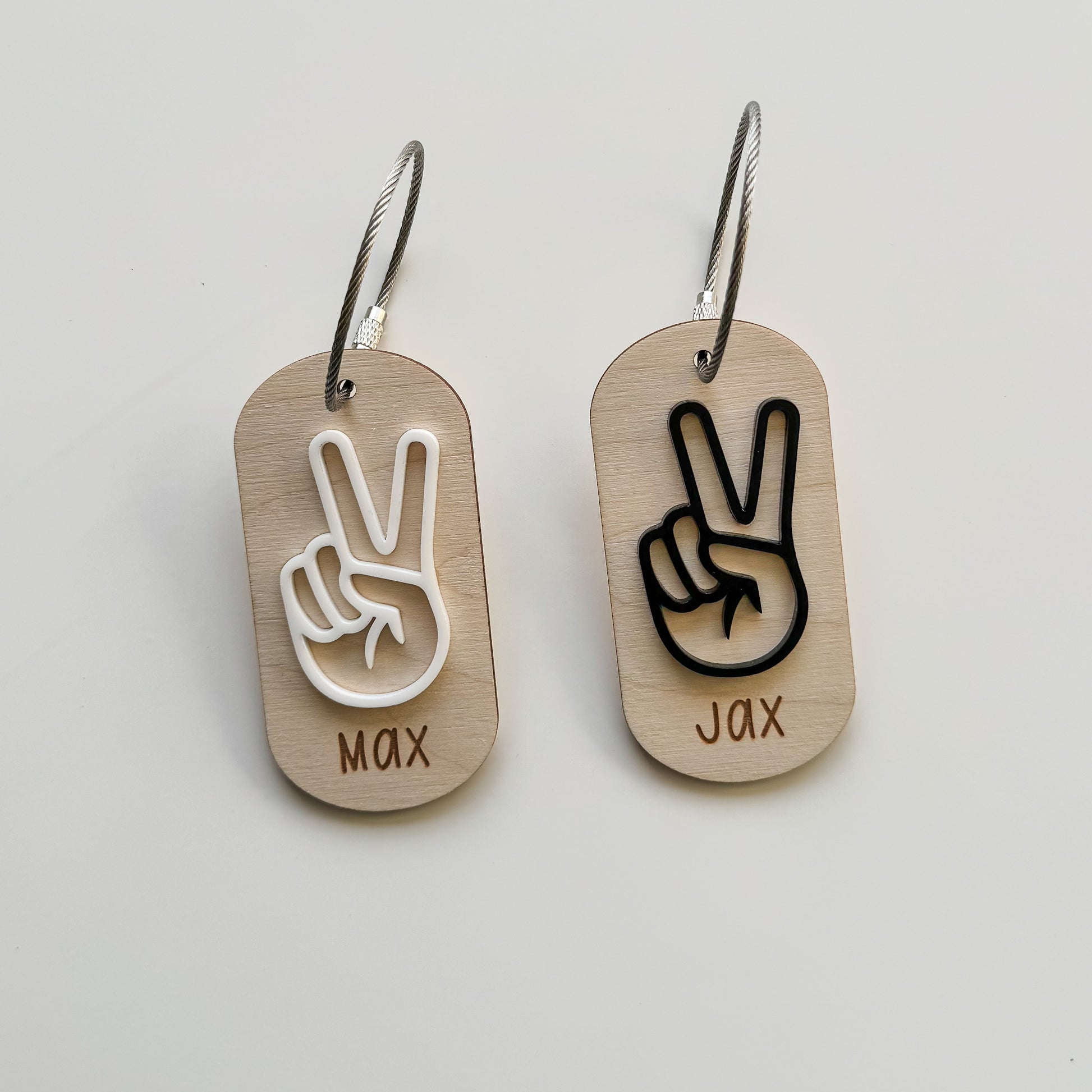 This customizable peace sign keychain/bag tag is perfect for backpacks, sporting bags and water bottles. Easily attaches with wire key ring, the twist closure ensures it wont come detached.