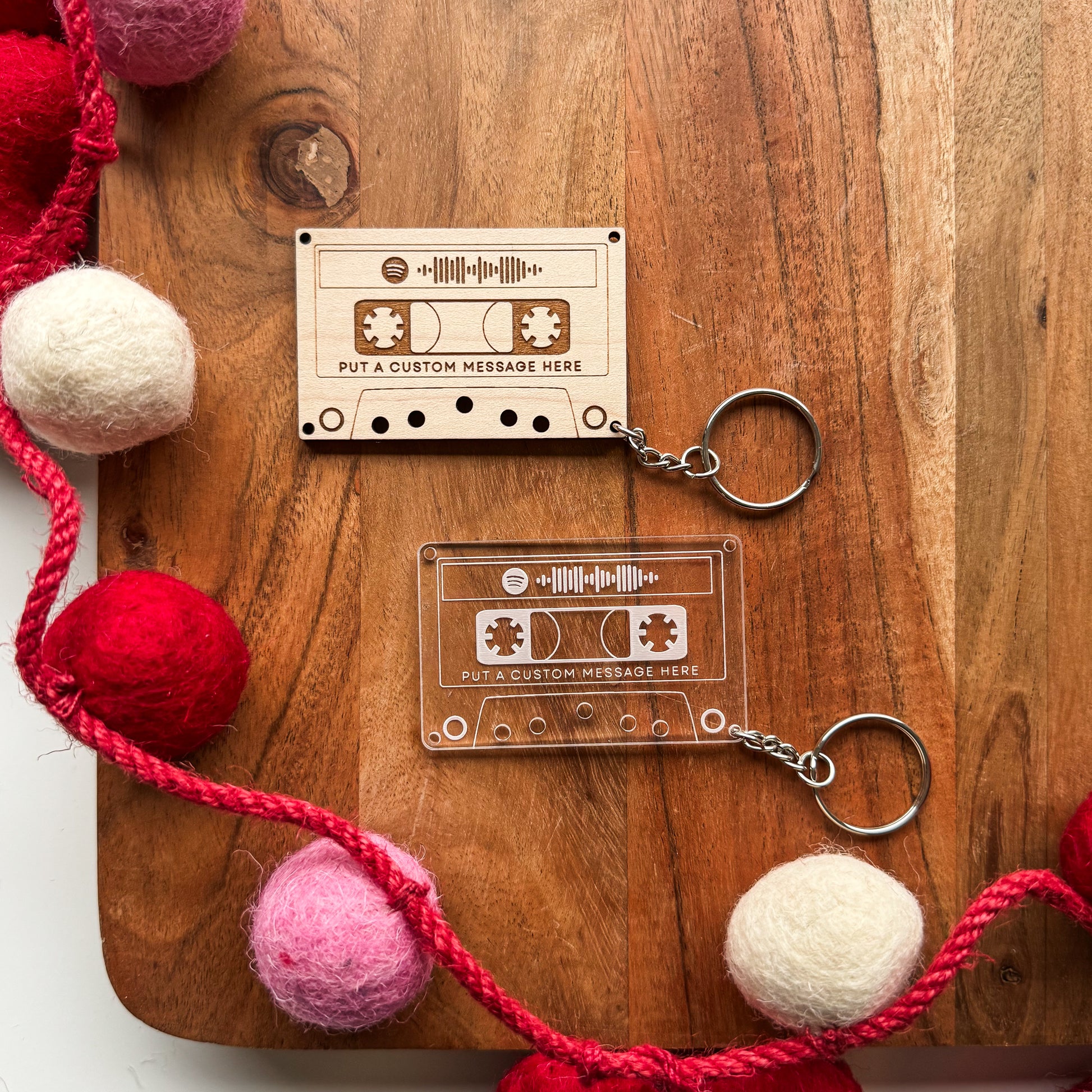 This retro cassette tape keychain can be customized with your own special Spotify code that easily scans to play a song, album or your favorite mixed tape playlist.