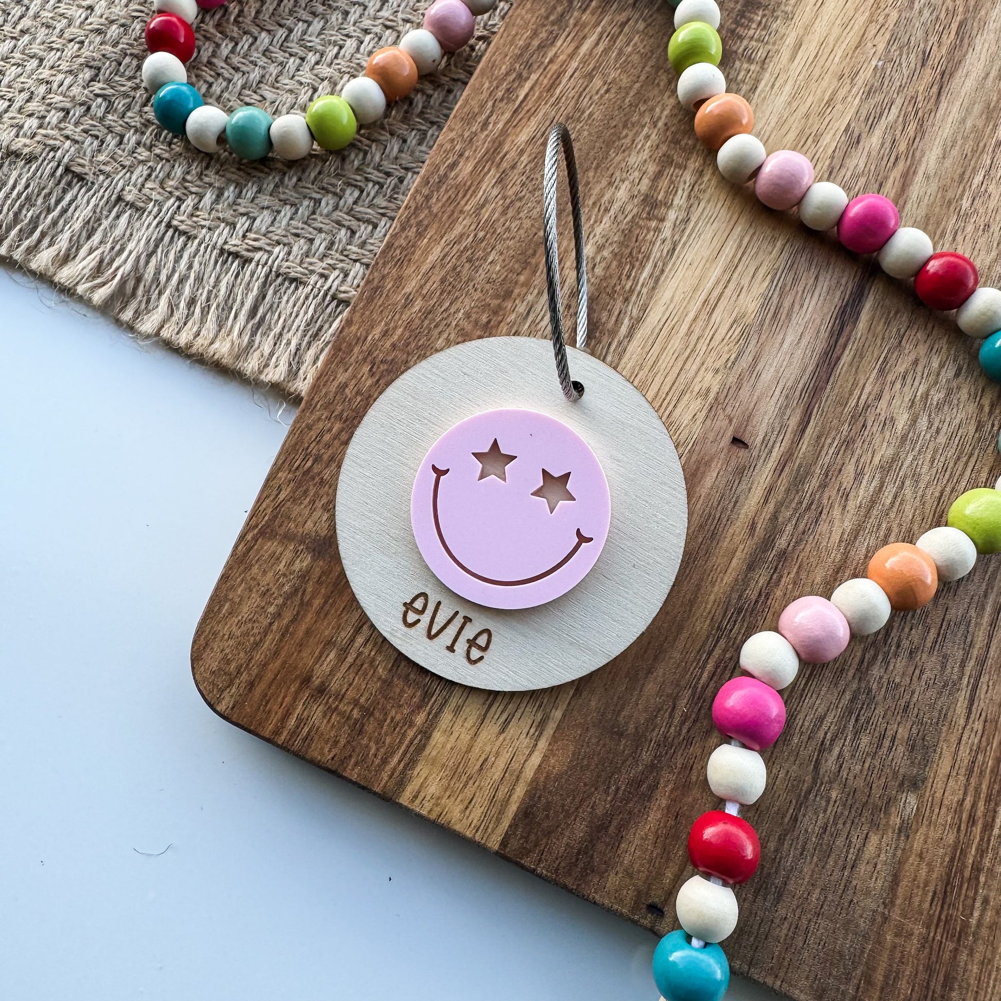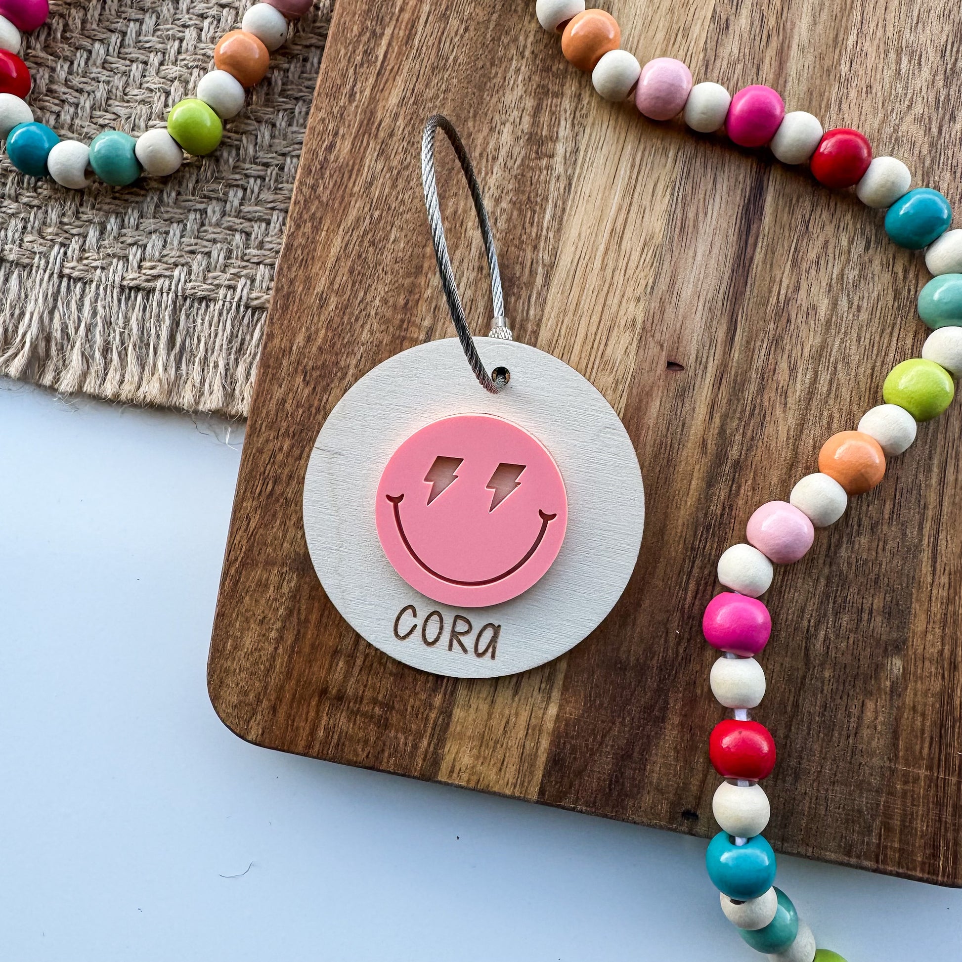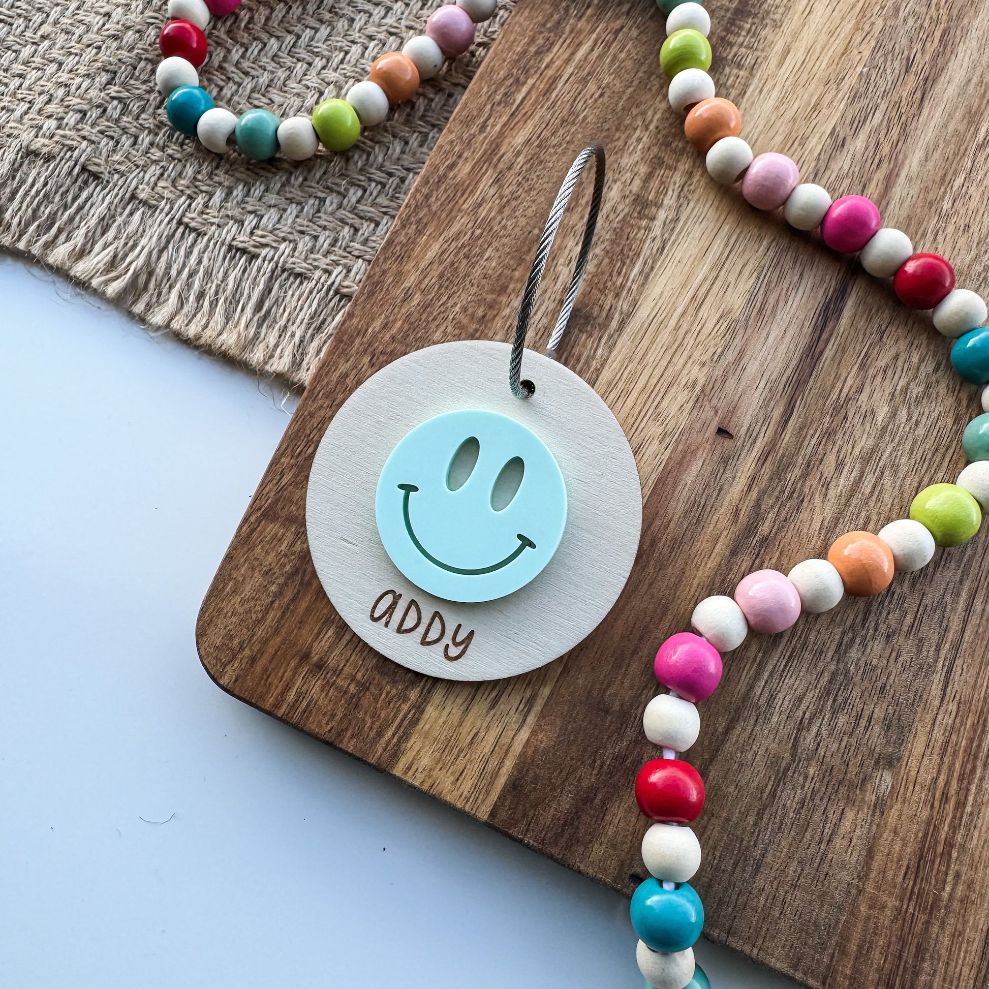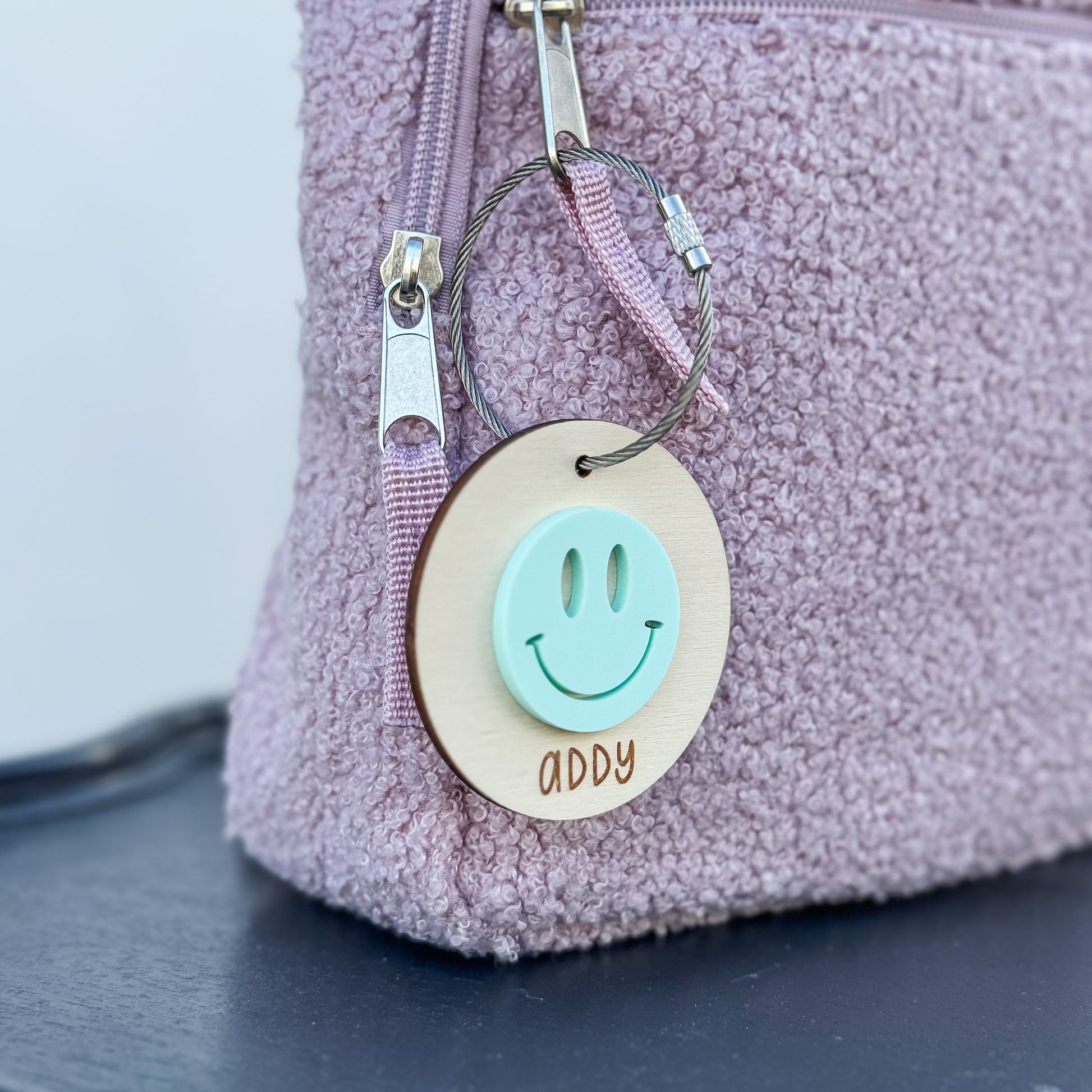 This smiley face keychain is perfect for backpacks, sports bags, lunch boxes, luggage, keys or just about anything.