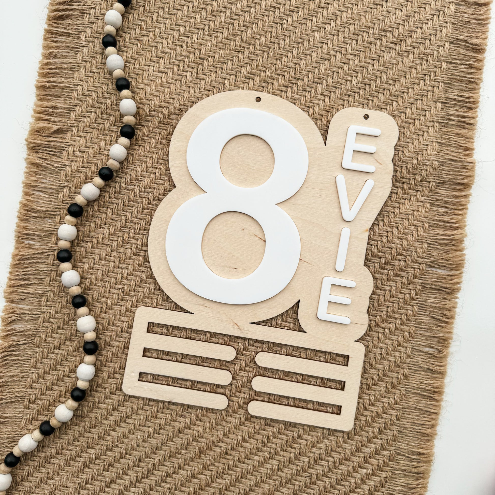 Time to get those medals on display. This piece is made custom to your kid's name & jersey number. Pending the length of your child's name and the number of digits the design may look slightly different than shown in the photos. We will reach out after purchasing to discuss the design layout, if necessary.